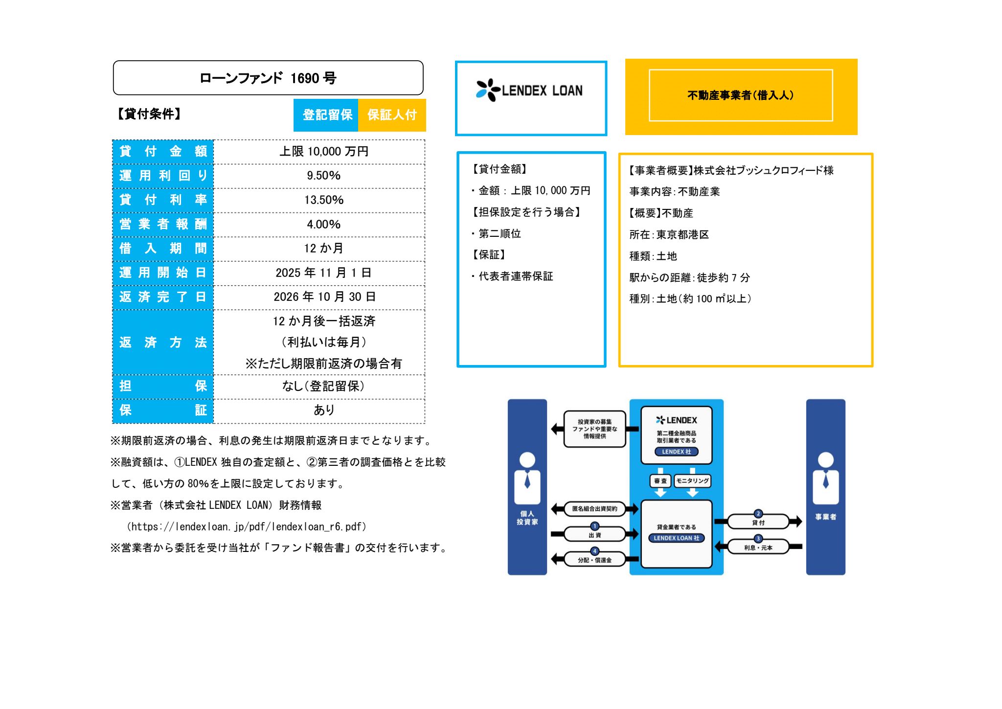 募集金額:10,000万円(利回り9.50%/年、期間12カ月、登記留保、有保証)